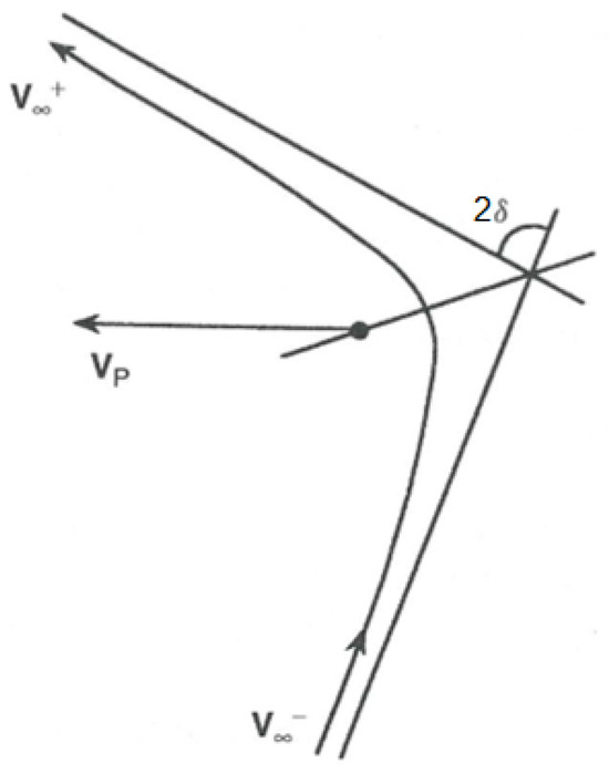 The direction of also indicates the direction of the incoming asymptote of the hyperbola. Due to the gravitational interaction between the two bodies, the asymptote is rotated by an angle, , that depends on the mass of the secondary, the hyperbolic excess velocity, and the minimum distance of the approach trajectory [35]:
