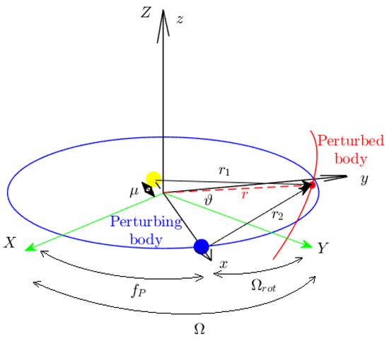 In this context, the restricted three-body problem (RTBP) represented a step forward in the description of the physics involved in the scenario where a small body is subject to the gravitational action of two massive bodies [21]. A popular application is the circular restricted three-body problem (CRTBP) [22], where the two primaries are in a circular orbit around their centre of mass. In the context of the elliptical restricted three-body problem (ERTBP) [22], an additional level of complexity is introduced by considering the primaries in an elliptical orbit.