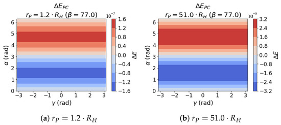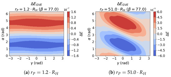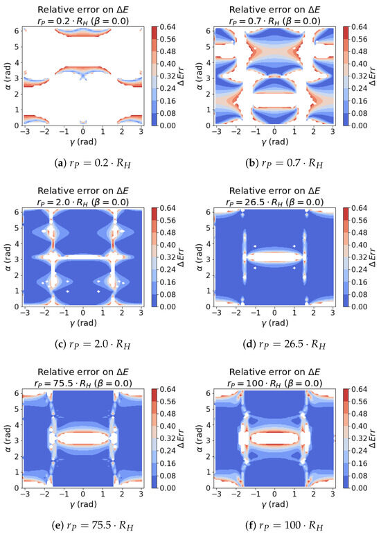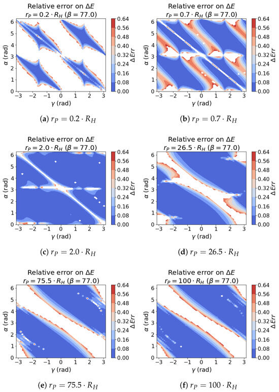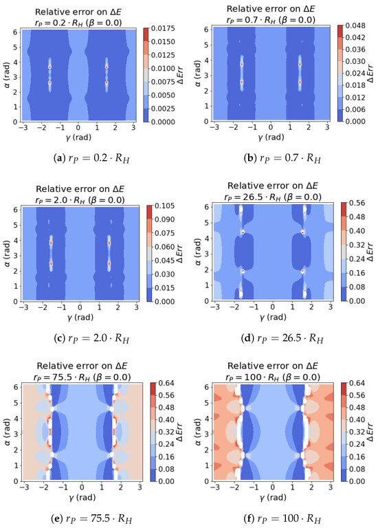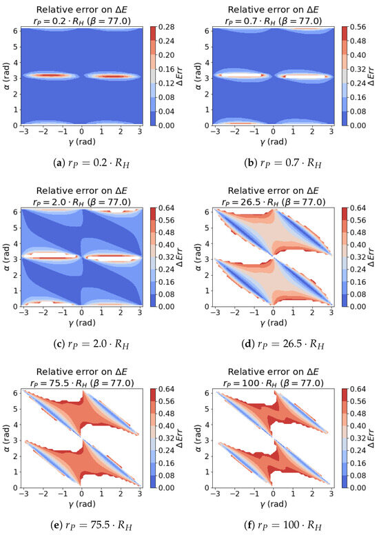 The plots in Figure 14 show the relative error in for an asteroid flyby at different distances from the perturbing body. To reduce the complexity of the problem and simplify the readability of the results, some of the parameters have been fixed, and only , and vary over the respective ranges. The other variables are , , and .