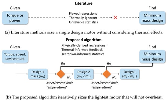 The algorithm is greater than the sum of its constituent sizing, efficiency, and thermal models. Teardown ((Figure 9)) revealed that motors exhibit a constant 10.3 g/ density defined as . This suggests that a specific iterative torque approach could accurately size mass if each iteration also predicts temperature. Specific torque () has the same units as . Our teardown shows is constant, so iterating over with thermal feedback (an improved literature approach) is no different than iterating over with thermal feedback (our approach). However, cooling is a function of the environment, geometry, and efficiency, which is a function of a motor’s electrical constants. Literature models assume a constant efficiency and cannot predict a motor’s dimensions or its internal electrical constants [1,3,14]. Our algorithm has models that capture each size, efficiency, and thermal facet, and the different models intelligently share their predictions to deliver more nuanced and realistic results.