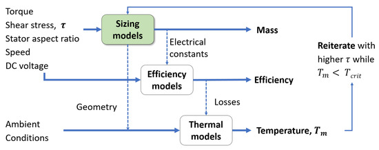 Figure 3 depicts the algorithm, which consists of a combination of analytical sizing, efficiency, and thermal models. First, the sizing model block estimates the ideal volume required to deliver a user-defined torque using an initial conservative shear stress (). Then, the sizing model block estimates the notional motor’s mass and outer dimensions, as well as the electrical constants of the notional motor. Next, an efficiency model block predicts the motor’s losses and efficiency with the user-provided loads and the sizing-estimated electrical constants. Finally, the thermal model block uses the (1) estimated losses from the efficiency block, (2) the estimated outer dimensions from the sizing block, and (3) the ambient temperature and flow conditions from the user to predict the motor’s temperature. If the predicted temperature () is below a critical temperature (), then the algorithm sizes a new motor using a slightly higher shear stress. The algorithm iterates until the notional motor’s steady-state temperature exceeds the specified thermal limit.