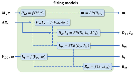 Figure 4 shows the internal sub-routines of the sizing block highlighted in Figure 3. These expressions consist of physics-based functions (), empirical regressions (), and a semi-empirical regression (). First, Equation (4) sizes the motor’s ideal volume () from a user-provided torque (M) and conservative shear stress (). Multiplying the ideal volume by an empirically derived density yields the motor’s mass (m). Using the ideal volume and a user-provided stator aspect ratio (), Equations (5) and (6) then yield the stator diameter () and length (). Using the previously predicted parameters, another set of empirical regressions predicts the outer diameter () and length (). Equation (2) and a semi-empirical regression estimate the motor’s electrical constants (, , and ) from the predicted stator dimensions and user-defined voltage () and operating speed ().