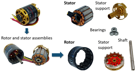 Table 2 lists each motor’s constituent components’ mass fractions. The motors are numbered in order of increasing total mass (). The stator and rotor, the two electromagnetically active components in a motor, constitute more than 50% of all motors’ total masses. This is because these active components are made of steel and copper, which are denser than the aluminum material of the supports.