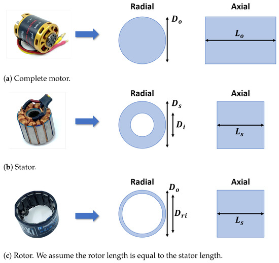 Researchers can also extend the sizing algorithm to other motor topologies like axial-flux motors. These motors often rely on liquid cooling with built-in heat exchangers; therefore, both the sizing and thermal models would require extensive re-development and testing. We specifically targeted conventional outrunner radial-flux motors because they are the most common motors for small UAS. Newer axial-flux motors are found in larger and more expensive manned applications [31], since axial-flux motors offer more specific torque [11,32].