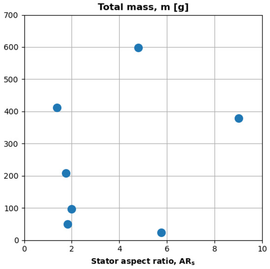 Figure 7 plots the mass and geometry of the teardown motors. The x axis is the motor aspect ratio (), and the y axis is the total mass (m). The figure shows that the motors provide good tradespace coverage. The data contain instances where the aspect ratio is constant and mass changes ( = 2, m ranges from 50 to 400; 5 and m ranges from 25 g to 600 g). Conversely, the data contain two instances where mass is almost constant and aspect ratio changes ( 37 g, ranges from 2 to 6; m = 400 g, ranges from 2 to 9). Low-aspect-ratio motors ( 1.0) do not commonly power small UAS.