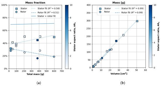 Figure 8a plots the stator and rotor mass fractions with respect to the total motor mass across the seven teardown motors. The x axis is the motor’s total mass, and the y axis is the mass-fraction percentage. The fill intensity of each data point represents the aspect ratio of the motor from which the component came. The figure also plots a linear regression of each dataset. Equations (7) and (8) are the linear regressions of the non-dimensional stator and rotor mass fractions, respectively ( and respectively) with respect to the total mass.