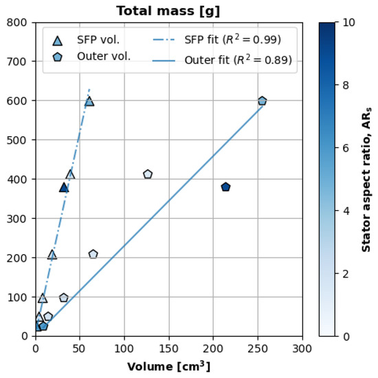 Figure 9 plots the motor’s total mass with respect to two different volumes. The y axis is the motor’s total mass, and the x axis indicates units of volume. The triangular points are mass versus the motor’s stator footprint (). The pentagonal points are mass vs. the motor’s outer volume (). The color bar corresponds to the motor’s stator aspect ratio.