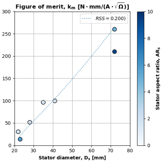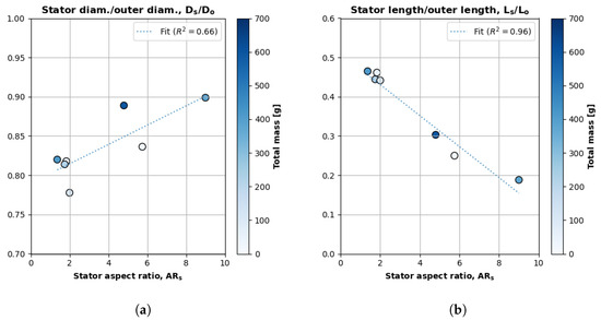 Figure 10a plots changes in the ratio of a motor’s stator diameter to its outer diameter. The x axis is the motor’s aspect ratio (), and the y axis is the motor’s stator–diameter ratio (). The fill intensity of each data point corresponds to the motor’s total mass. Figure 10a also plots the linear regression of the stator’s outer diameter ratio relative to the aspect ratio (Equation (16)).