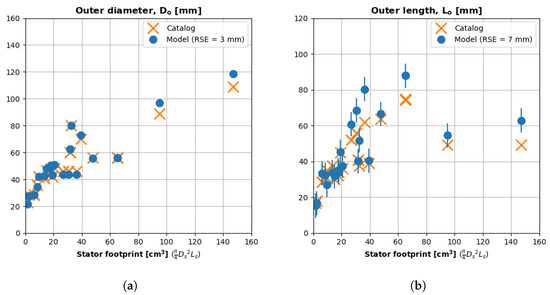Figure 9 also plots linear regressions of each dataset. The slope of the mass–stator footprint regression (Equation (14)) is greater than the slope of the mass–outer volume regression (Equation (15)) because a motor’s stator footprint (Equation (5)) is smaller than its outer volume (Equation (13)).