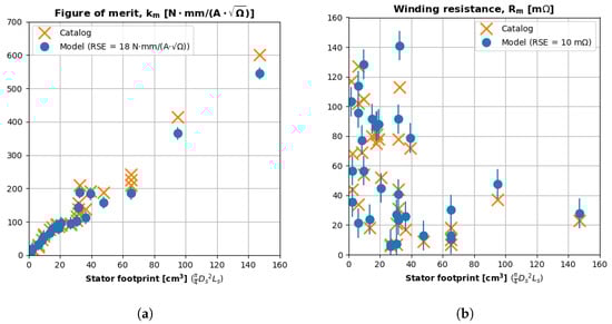 We developed two semi-empirical versions of Equation (18) via power-law regression of teardown data (Equations (19) and (20)). We approximated magnetic loading and copper resistivity as constants, since they are material properties that are essentially the same for high-quality BLDC motors [26]. Equation (19) is a regression that approximates the copper volume as the stator footprint (, Equation (5)). The residual sum of squares (RSS) for this regression is 0.2. Equation (20) is a regression that more accurately approximates the copper volume as the stator volume (, Equation (9)). The RSS for the copper–stator volume regression (Equation (20)) is 0.218. Approximating copper volume using stator volume is more physically accurate because the hollow stator volume (Equation (9)) excludes the central space occupied by the shaft and bearings.