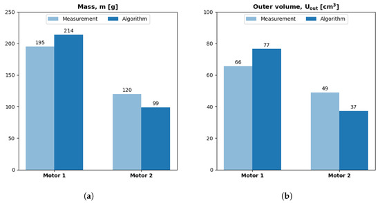Figure 9 reveals that the ratio of mass to stator footprint () is more consistent than the more physically intuitive ratio of mass to outer volume (). The linear regression of to has a smaller value, and we can see its superior robustness around 400 g. At this mass, one motor has an aspect ratio of less than 2, and the other has an aspect ratio greater than 8. The latter motor () has roughly double the outer volume of the former motor; however, their stator footprints (SFPs) are almost the same. This suggests we should use and ratio ≈ 10.3 g/ to estimate mass from a notional stator footprint because this quasi-density is less susceptible to variations in geometry.
