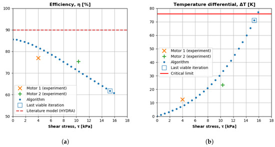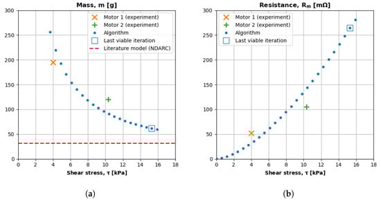 There seems to be a linear relationship between shear stress and motor efficiency. The algorithm predicts a nearly linear decrease in efficiency as shear stress increases (Figure 19a) for a constant output torque and rotational speed (and thus, constant output power). Increasing shear stress reduces volume, and reducing volume decreases the figure of merit (), which reduces a motor’s ability to convert current into torque rather than waste heat. Therefore, the observed trend principally agrees with the theory. In the future, researchers can attempt to derive an analytical expression to explain this phenomenon.