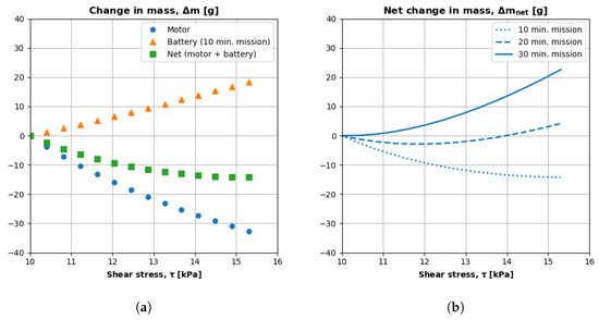 Figure 20a plots the predicted mass changes for a 10-min mission. The x axis is the shear stress, and the y axis is the change in mass relative to the initial iteration. The blue dots are the changes in motor mass, and the orange triangles are the changes in battery mass. The green squares are the sum of motor and battery mass changes.