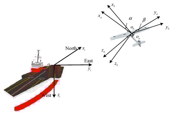 In this problem, three reference frames are defined as shown in Figure 1, including an inertial and two body-fixed coordinates. The inertial frame is fixed to the Earth. is the body-fixed frame of UAV, where the coordinate origin is located in the center of mass, the -axis is aligned with the UAV’s body axis, pointing towards the UAV’s head, the -axis points towards the UAV’s right wing, and the -axis points towards the UAV’s belly. is the airflow coordinate system, which is generated by rotation, the -axis is rotated by an attack angle , and the -axis is rotated by a sideslip angle , so that the -axis aligned with the airspeed vector.