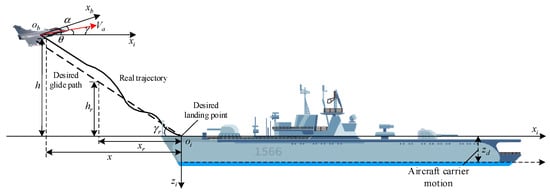 Figure 3 shows the final descent phase glide slope as the UAV approaches the ship. The reference glide slope is fixed on the carrier deck, with a tilt angle . As the ship moves vertically due to sea motion, the actual height adjustment needs to account for this movement. The distance between the UAV and the ship’s reference point is , and the height of the reference glide slope above the deck is . Thus, the height of the reference glide slope in the absolute coordinate system is
