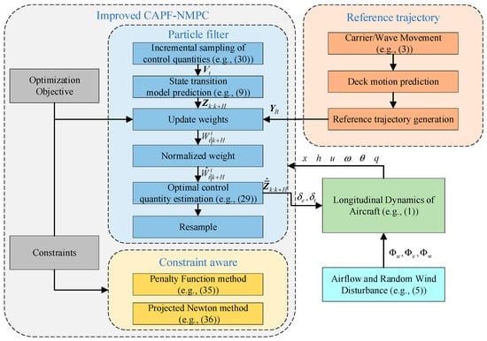 In this paper, a constrained perception particle filtering approach based on the concept of Bayesian optimal estimation is proposed to solve the optimal control problem. This method interprets the NMPC problem as an estimation problem of future states and control inputs within time steps based on virtual observations. The architecture of the aircraft carrier autonomous landing system based on the CAPF–NMPC method is shown in Figure 4; the system is composed of the reference trajectory generation module and the improved CAPF–NMPC subsystem.