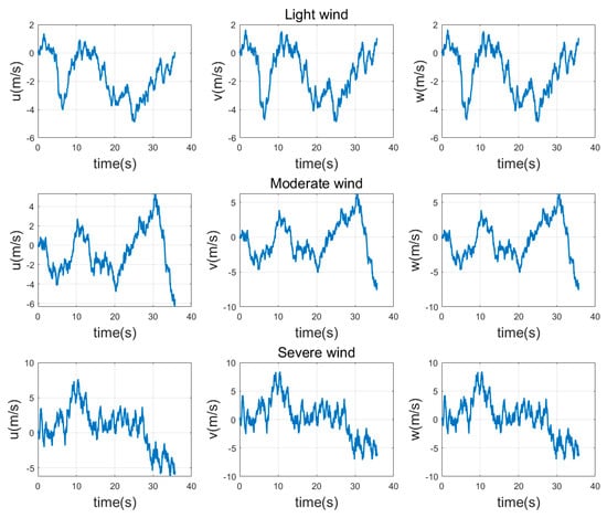 Different approaches have their own merits and applicability. Navier–Stokes equations are often used to describe the motion of a viscous incompressible or compressible fluid with conserved momentum, especially for incompressible flows; Navier–Stokes equations are nonlinear vector equations. However, these make the wind field model very complex, which is not conducive to the subsequent design. The Dryden wind model is specifically designed to describe the effects of atmospheric turbulence on aircraft through a statistical approach, and it is suitable for engineering applications and real-time simulations []. According to the Dryden wind speed model, atmospheric disturbances are typically classified as stable wind, atmospheric turbulence, and wind gusts. Firstly, the wind speed is decomposed based on the inertial coordinate system.