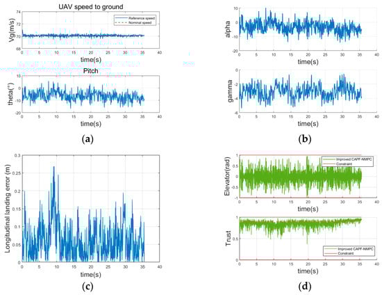 Simulation results using improved CAPF–NMPC with severe wind: (a) UAV state variable; (b) attack angle and track angle of UAV; (c) longitudinal landing error with improved CAPF–NMPC method; (d) improved CAPF–NMPC controller output.