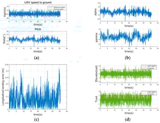 Simulation results using CAPF–NMPC with severe wind: (a) UAV state variable; (b) attack angle and track angle of UAV; (c) longitudinal landing error with CAPF–NMPC method; (d) CAPF–NMPC controller output.