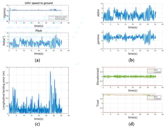 Figure 7a depicts the ground speed and pitch angle. It can be observed that the speed increases at the beginning and then remains at a value close to the target. This indicates that the controller is highly effective in regulating the speed. Additionally, Figure 7b illustrates the angle of attack and the track angle. It is essential that the track angle remains at around −3.5°. In the event of wind disturbance, the simulation outcomes demonstrate that the track angle exhibits minimal fluctuations. Furthermore, the error curve in Figure 7c illustrates that the controller’s position error is relatively minimal, indicating its effective landing performance. The control quantities in Figure 7d also demonstrate stability with lesser chattering and within the constraints.