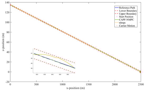 In this section, the carrier landing of a UAV using a CAPF–NMPC method is simulated in different sea conditions. At the same time, the classic controller nlmpc of MATLAB is used to compare with the proposed CAPF–NMPC method. It is assumed that the UAV has entered the approach position of the landing carrier. The altitude is 135 m and the initial state variable of the UAV is . The initial position of the aircraft carrier is , and the UAV is required to carry out the landing on the carrier with the reference glide slope of .