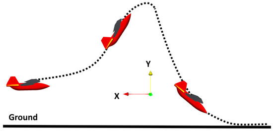 The full UAV (wing, fuselage, elevator) was modeled in the simulations, as shown in Figure 6. It was a typical UAV with a wingspan of 1.5 m. As shown in Figure 7 on the left, the UAV was in a neutral wing position during forward flight. However, its wings deformed to a “retract forward” position on the right figure to allow it to perform a perching maneuver by pitching up in flight and landing shortly after. The vertical distance of the UAV above ground was designed at 2.5 m, and the simulation for each case ran for a maximum of 3 s, or shorter if it reached ground before that.