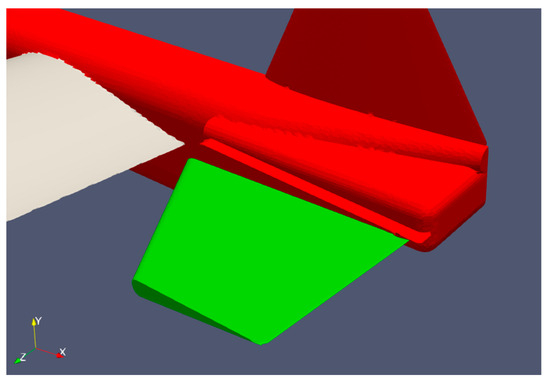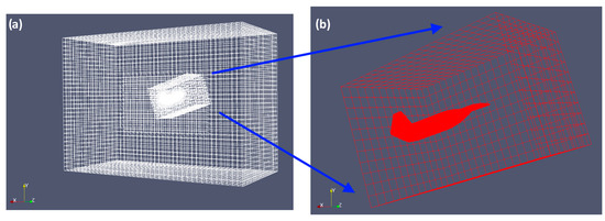 Due to the large deformation from the perching maneuver, it is not possible to use the standard body-fitted grids with mesh deformation, as the grid quality deteriorates as the pitching angle increases. An alternative is to use overset or Chimera grids [13]. As shown in Figure 2, the foreground grid consists of the UAV’s wing, fuselage, and tail, while the background grid is stationary. In this way, the UAV can pitch without suffering from grid quality deterioration. Moreover, more than one moving body can be simulated using this method.