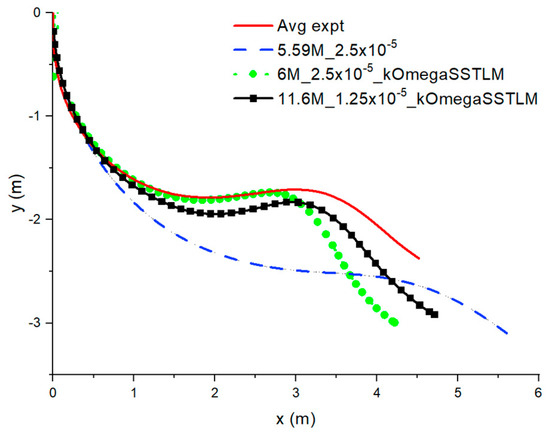 Trajectory plots of y against x for the experiment, numerical laminar, and kOmegaSSTLM results.