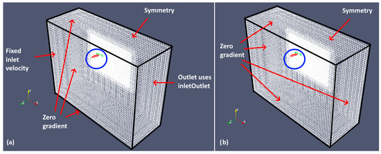 Velocity boundary conditions for the (a) static and (b) moving grid simulations. The blue-circled region indicates the UAV position.