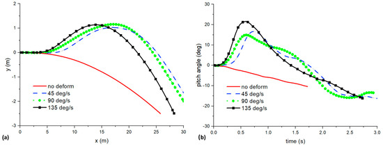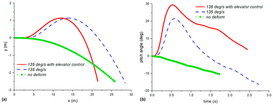 Comparison of (a) trajectories and (b) pitch angle of nonpure deformation and deformation with elevator control cases.