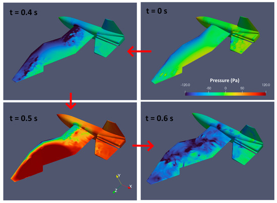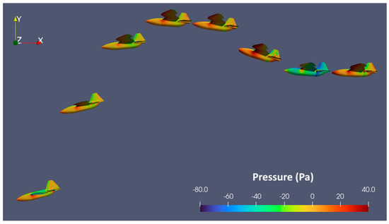 Figure 11 shows the combined snapshots of the 45 deg/s case from t = 0 to 2.8 s, with a lapse of 0.4 s per image. Its corresponding drag Fx and lift Fy variations against time are given in Figure 12. One can observe that as the wing deforms and retracts forward, it pitches up due to the positive pitch (assuming that clockwise is positive). This increases the lift generated by the wings, and the UAV increases its altitude. However, as the pitch angle continues to increase, stall starts to set in and lift and drag start to decrease and increase, respectively. There is a slight lag between the variation of lift and drag. The UAV then begins to decrease its altitude and pitch down rapidly due to a pitching-down moment. As the AoA decreases, drag decreases too. Figure 13 shows a close-up view of the wing deforming and retracting, with the contour showing the change in pressure within the 0.6 s time frame. Between t = 0.4 and 0.6 s, we can observe the large pressure change. For this 45 deg/s case, it takes 0.5 s to finish the wing retracting motion.