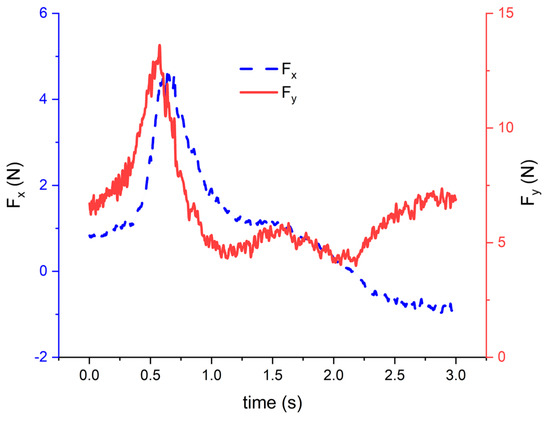Force (a) Fx and (b) Fy against time plot for the pitch-up maneuver.