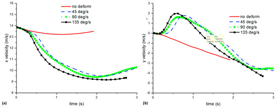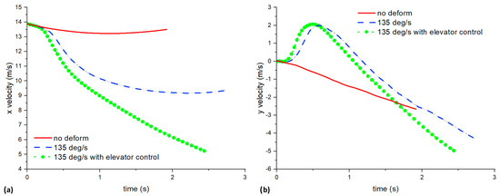 Comparison of (a) x and (b) y velocities against time of nonpure deformation and deformation with elevator control cases.