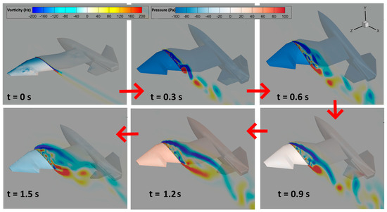 Figure 16 shows the comparison of x/y velocities of non-deformed, pure deformed, and deformation with elevator control cases. The UAV with elevator control managed to reduce its x velocity to around 5 m/s, which is even lower than the pure deformed case of around 9 m/s. This result shows that the elevator greatly helps to reduce landing speed and displacement. With CFD, we can also visualize the flow fields to obtain a better understanding of the aerodynamics. Figure 17 shows the vorticity at the z = 0.4 m slice and surface pressure on the deforming wing with elevator control during the pitch-up maneuver from t = 0 to 1.5 s. As the wing deformed, the UAV pitched up, and it created a leading-edge vortex (LEV). At t = 0.6 s, the UAV’s pitch angle reached its maximum. The LEV remains attached, and the trailing-edge vortex (TEV) starts to appear as well. LEV is an important component of unsteady flight, especially in flapping-wing flight cases, and it can help to create a large lift force [20]. The study by Adhikari et al. [8] also mentions the importance of the stability of the LEV on the lift. We can also observe how the surface pressure of the wing changes throughout the process. Although it was not done here, it is possible to compare and analyze the different perching configurations and visualize the vorticity and pressure contours to see how it is possible to achieve a higher pitch angle or lower forward velocity. This highlights another advantage of using this 6DOF CFD analysis.