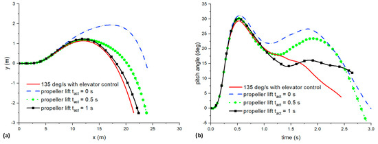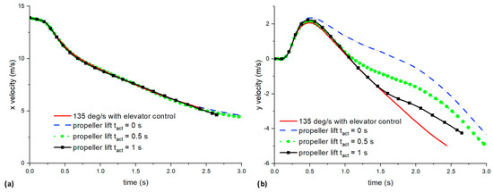 Figure 19 shows the comparison of x/y velocities against time for elevator and emulated propeller cases for all cases. There was almost no difference in the decrease of x velocity between the different cases, except that for cases with propeller lift, the x velocity at landing was slightly lower (4.4 against 5.2 m/s). This was still beneficial for landing. In terms of y velocity, for cases with propeller lift at t = 0 and 1 s, their y velocity magnitude at landing was relatively smaller (4.2/4.3 against 4.9/5 m/s) than the other two cases. These results show that propeller lift can help to reduce the landing x and y velocities by a small margin. The algorithm used for the propeller lift is relatively simple, and hence, a better algorithm, such as the use of deep reinforced learning [3], may be able to give a better performance.
