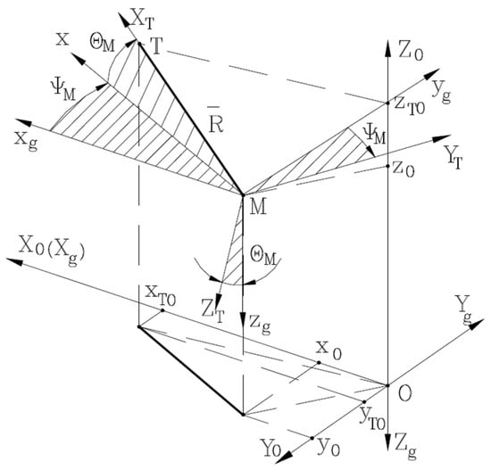 The orientation of the body frame related to the local (start) frame is defined according to [17]. We will start by constructing the rotational matrix between the local and body frames to deduce kinematic equations using Euler-type attitude angles. For this purpose, starting in the local frame and ending in the mobile ground frame (), a 180° rotation around the axis is necessary, after which, in order to overlap the mobile ground frame () over the axes of the body frame (), we successively apply three rotations with angular velocities , and around the axes and , respectively: