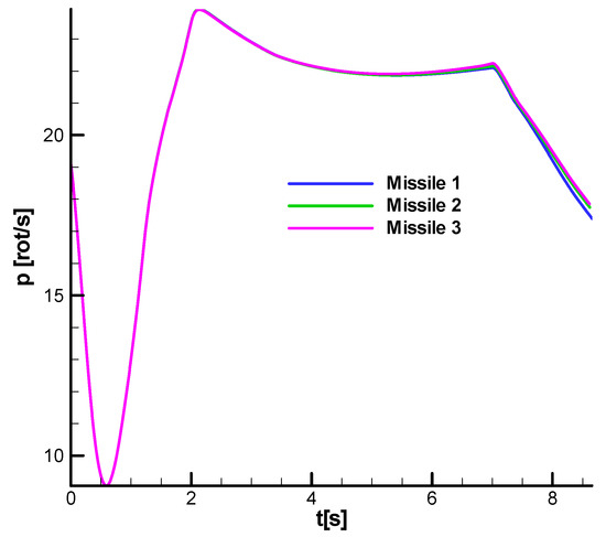 Next, we will rewrite the dynamic equations of rotation. We will consider the gyroscopic coupling terms highlighted by the transition from the body frame to the Resal frame and consider null the components of the disturbing moment from aerodynamic and gasodynamic asymmetry. In addition to the conditions imposed on the stabilized-roll base motion, we will consider that the evolution in the vertical plane is translational, i.e., . At the same time, as we did in the case of translation equations, in the pitch moment equation development, the terms corresponding to the slow mode will be considered null. Similarly, the yaw moment equation development will not be affected by the roll motion, which is also considered frozen. Instead, gyroscopic coupling and Magnus terms arising from rotational movement around the longitudinal axis will be highlighted. With these additional clarifications, linearizing (20), we obtain the following: