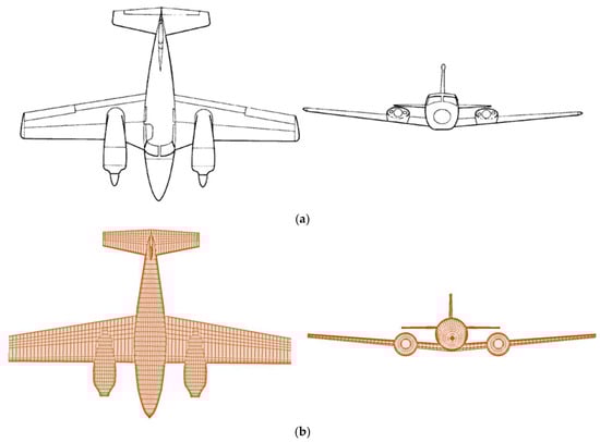 The twin-engine propeller-driven small airplane under investigation is referenced from NASA’s report [40,41], denoted as (a) for the reported aircraft and (b) for the modeled aircraft utilizing MAPLA.