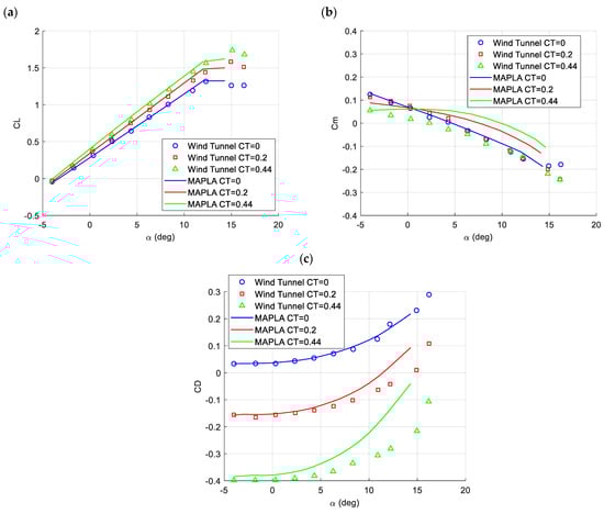 The deviation results of MAPLA from the wind tunnel test results are presented in Table 2. With respect to the deviation results presented in Table 1, MAPLA’s results presented an accuracy of 5% for lift coefficient values for power-off conditions in the case of CT = 0.2 and even higher CT values of 0.44. The same could be seen for the power-off conditions for the drag coefficient results. However, as power increased, the results’ deviation also increased by up to 15% for CT = 0.2 and 35% for CT = 0.44. For the pitching moment coefficient results, MAPLA presented a higher deviation from the wind tunnel test results, starting from 10% for the power-off condition and increasing to up to 20% and 50% for CT = 0.2 and CT = 0.44, respectively. For lateral-directional characteristics, MAPLA reported a higher deviation from the wind tunnel test results, where, for the weathercock stability analysis, the reported value for power-off conditions showed a deviation of 35%, and this value increased for the higher power conditions to up to 40% for CT = 0.2 and 45% for CT = 0.44. The dihedral effect characteristic showed a better accuracy, with a 25% deviation from the wind tunnel test results for CT = 0, 15% for CT = 0.2 and 10% for CT = 0.44. Overall, MAPLA showed better accuracy for longitudinal aerodynamic characteristics compared to the lateral-directional characteristics. The results indicated that MAPLA’s aerodynamics module is able to determine the aerodynamic characteristics of small aircraft with acceptable accuracy for low-fidelity analysis, where conceptual and preliminary studies are of interest. However, compared to the other methods such as DATCOM [34], MAPLA’s results are closer to the wind tunnel test data in almost all studied conditions for linear angles of attacks.