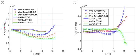 In the subsequent sections, Figure 2a–c delineate the longitudinal aerodynamic characteristics of the investigated aircraft across various flight conditions. Additionally, Figure 3a,b compare the lateral-directional aerodynamic characteristics of the twin-engine propeller-driven small aircraft using MAPLA with the corresponding data obtained from available wind tunnel tests [35,36]. All results are presented for the power-off conditions, where the trust coefficient of the propellers CT is equal to zero up to CT = 0.2 and CT = 0.44. The trust coefficient parameter that accounts for propeller effects could be defined using the below formula: