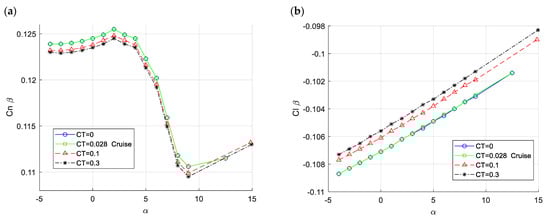 Figure 6 illustrates the lateral-directional static results of the twin-engine propeller-driven small aircraft in different flight conditions. It is evident that similar to the longitudinal characteristics, propeller effects intensify the values across all angles of attack.