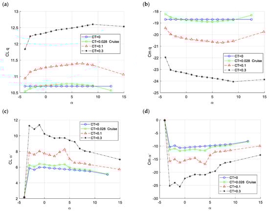 Results of investigated twin-engine propeller-driven small aircraft model in 1/rad in various flight conditions, where CT = 0, CT = 0.028, CT = 0.1, and CT = 0.3, versus angle of attack for (a) lift coefficient due to pitch rate, (b) lift coefficient due to vertical acceleration, (c) pitching moment coefficient due to pitch rate, and (d) pitching moment coefficient due to vertical acceleration.