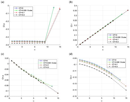 Finally, Figure 8 shows the lateral-directional dynamic characteristics of the twin-engine propeller-driven small aircraft. Remarkably, akin to the observations made in the static characteristics, the influence of propeller effects is discernible, intensifying the values across all angles of attack. However, it is noteworthy that the results for Clp and Cnr were more significantly impacted by the propeller effects compared to those of Clr and Cnp. This consistency highlights the significant impact of propeller dynamics on the aircraft’s lateral-directional behavior, underscoring the need to account for such effects for comprehensive aerodynamic analysis and design optimization.