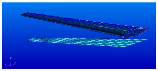 In the subsequent phase, the Aero-Structure Coupling module of NASTRAN was employed to generate the coupled aerodynamic and structural models for aeroelastic analysis. Accordingly, from the Flightloads module, using the Aero Modeling tool, Flat Plate aero modeling was selected. For the Flat Plate aero modeling, it was crucial to appropriately select the surface. As illustrated in Figure 10, the nodes on the surface were first chosen chordwise and then spanwise, and this approach was also used for meshing, ensuring that the mesh was generated chordwise first and then spanwise. Next, using the aeroelasticity module of NASTRAN, under the Aero-Structure Coupling section, both structure and aero models were selected to initiate the coupling process. Finally, by choosing the Auto Select Spline option, the Aero-Structural Coupling process was completed. The resultant Aero-Structural Coupling model is depicted in Figure 11. Following the creation of the Aero-Structural Coupling model, the Aeroelastic Analysis module was utilized, with the solution type set to Static Aeroelasticity. Specifically, the Flexible Trim method from NASTRAN was employed for this analysis.