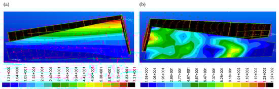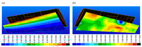 The pressure distribution on the wing in Newton per square meter considering (a) rigid components in the model and (b) elastic components in the model.