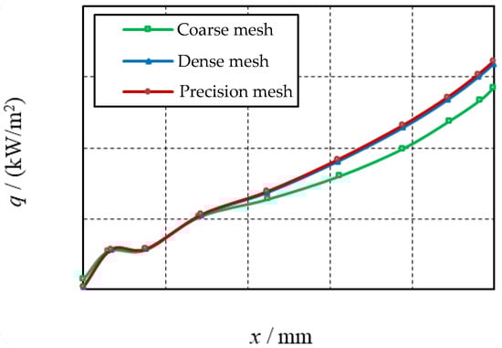 In this study, the commercial software Fluent was used for numerical calculations with a semisymmetric model, and the grid model is shown in Figure 4. Three sets of coarse (2 million), dense (3.5 million), and precision (4.5 million) grids were used to perform the grid-independent validation. The turbulence model was based on the standard k-ε two-equation model, and the wall function was treated with an enhanced wall treatment to keep y+ around 1. In Figure 5, the density distribution of the heat flow at the wall surface under different grid sizes is shown. The deviation between the dense grid and the precision grid calculation results was small, and 3.5 million grids were selected for calculation in this study.