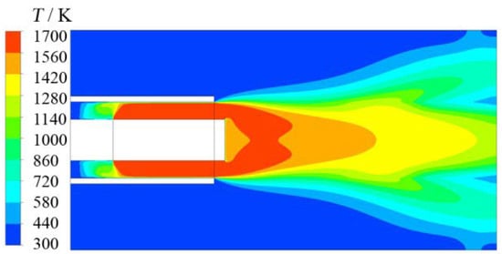 The combustion gas temperature was set at 1700 K, and the surface temperature of the metal fibre was set at 1100 K [15]. The calculation of the heat flow on the specimen surface under different working conditions was carried out by changing the incoming flow rate. The surface temperature and heat flow distribution of the specimen was analysed by taking into account one of the working conditions, the combustion gas temperature distribution of the domain between the inner surface of the specimen and the surface of the metal fibre, as shown in Figure 6. The distribution of the heat flow was avoided in the cylindrical specimen, as shown in Figure 7.