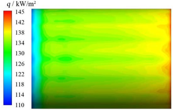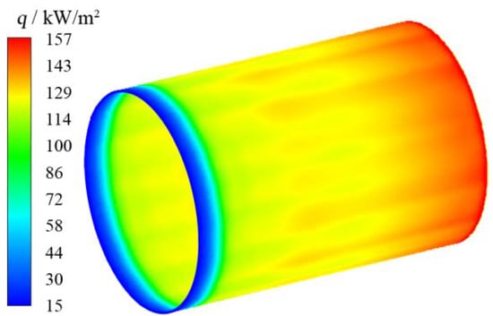 Optimal solution No. 1968 was used to verify the results of the optimisation, i.e., . The heat flux distribution on the inner surface of the specimen calculated by CFD for optimal solution conditions is shown in Figure 14, which shows a significant improvement in uniformity compared to the heat flux distribution of the cylindrical metal fibre in Figure 7.