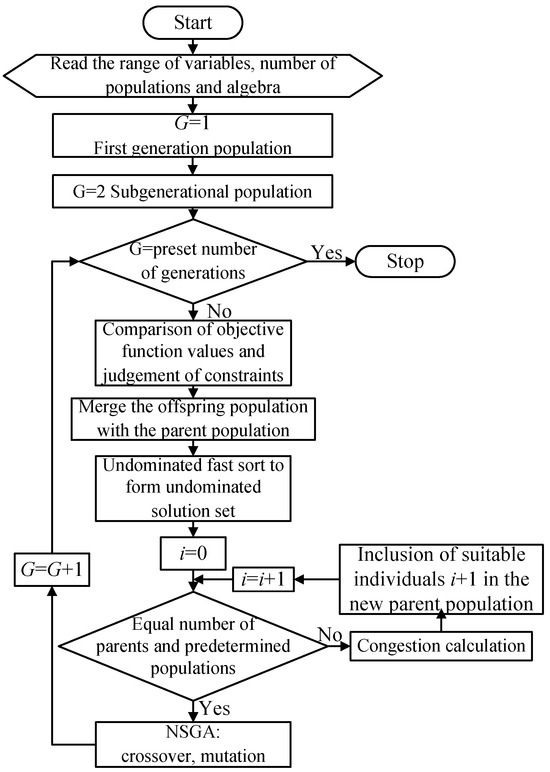 For the above bi-objective optimisation problem, this study adopted the non-dominated sorting genetic algorithm (NSGA-II) [20] with an elite strategy to carry out the optimisation design. The computational flow is shown in Figure 9. First, initial parent populations (G = 1, where G is the number of population generations) were randomly generated within the range of values of the optimisation variables. Then, the parent population generated offspring populations of the same size. The parent and offspring populations were merged to form a population of size 2N. The newly generated population was subjected to non-dominated fast sorting, and the degree of crowding was calculated for all individuals in this population of size 2N. According to the degree of crowding relationship between the individuals and the degree of crowding of the individuals, the appropriate individuals were selected to form a new parent population of size N. The new parent population was then selected by the traditional genetic algorithm (NSGA). Then, the crossover, mutation, etc. of the traditional genetic algorithm (NSGA) was used to generate a child population of size N, which was merged with its parent population. The above non-dominated fast sorting process was repeated until the number of population generations was equal to the preset number of generations.