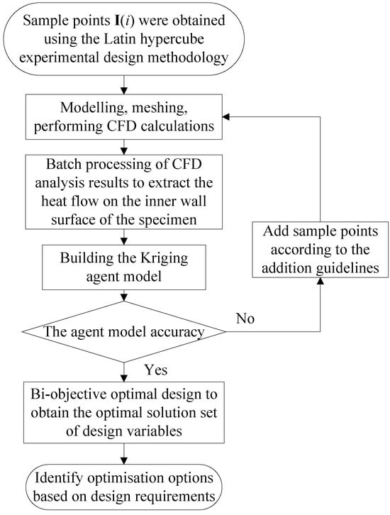 Figure 10 shows the flow chart of the design method for matching the thermal test parameters of metal fibre surface combustion structures based on the kriging surrogate model and dual-objective optimisation design. It mainly includes the experimental design, construction of a design scheme for matching the test parameters, construction of the surrogate model for the heat flow on the inner wall surface of the specimen, accuracy analysis of the surrogate model, and bi-objective optimisation design.